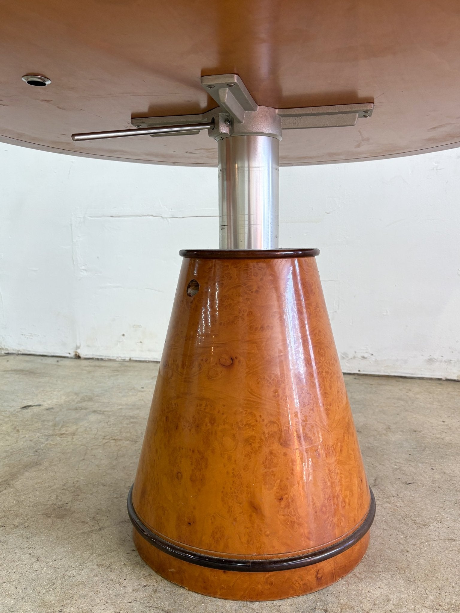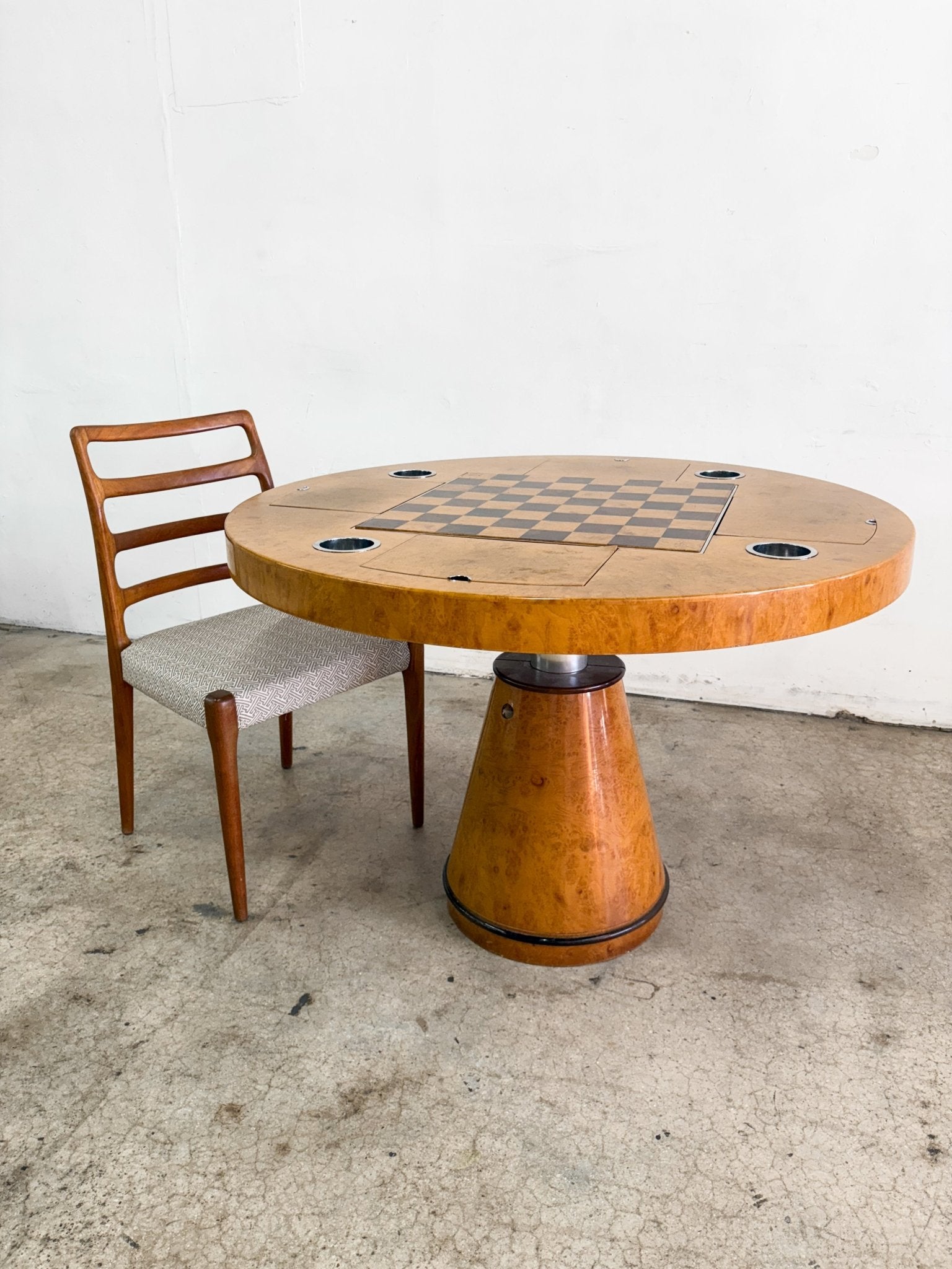 Adjustable-height burl gaming table with built reversible chessboard. Four seats with cup holders and fold-up storage compartments. Some minor wear, a few colored paint specs, and small corner lifting on one compartment door.