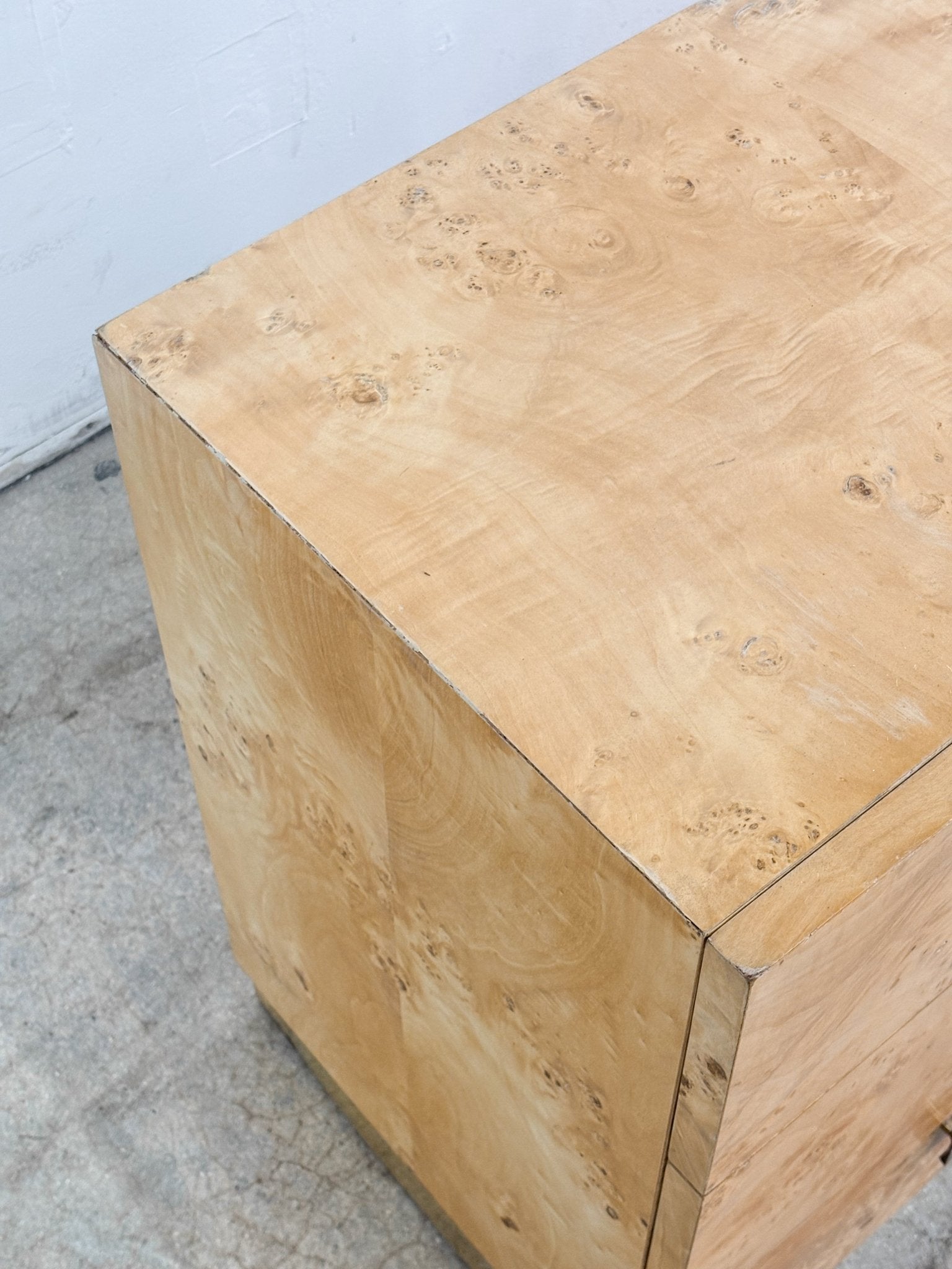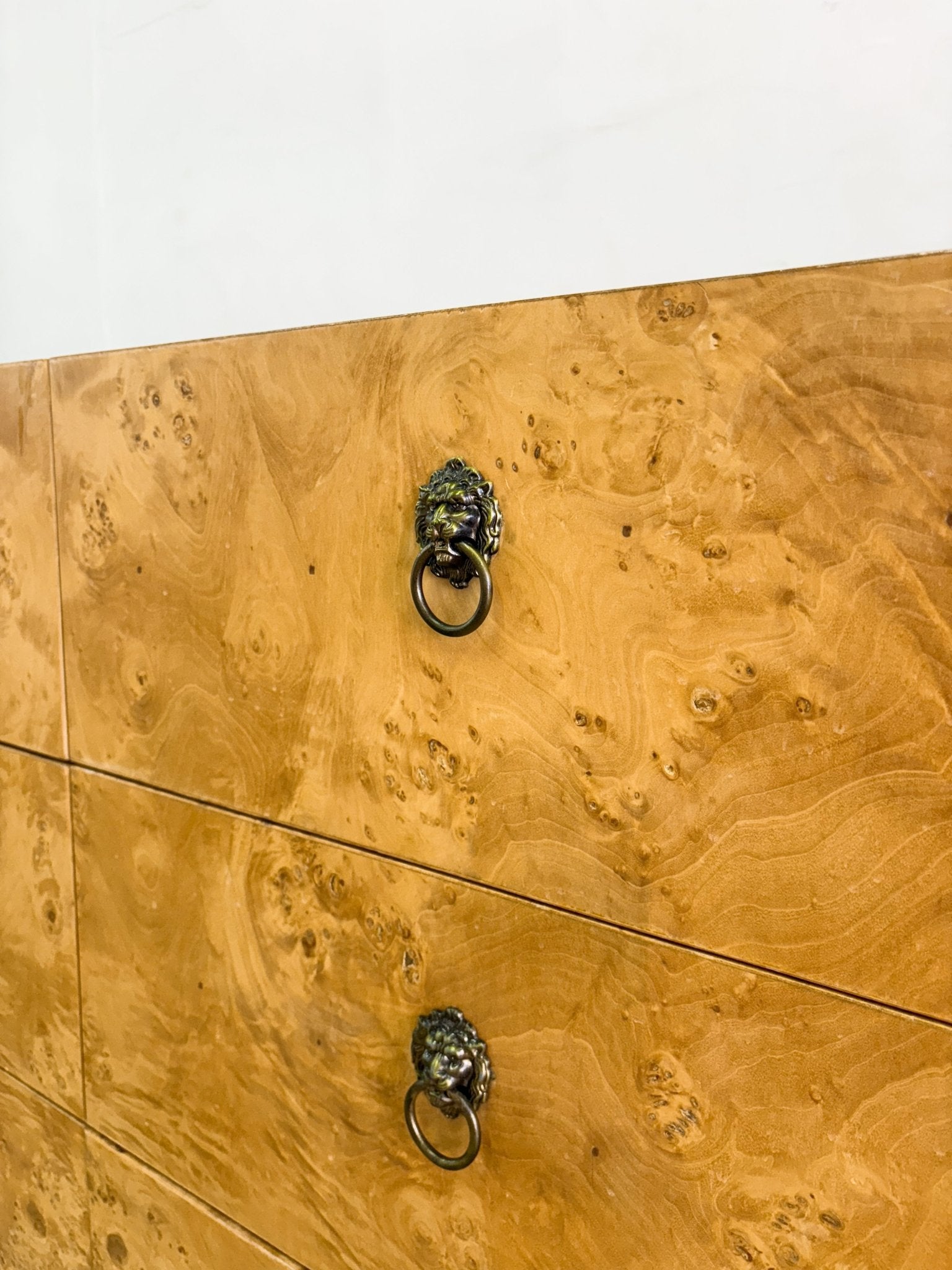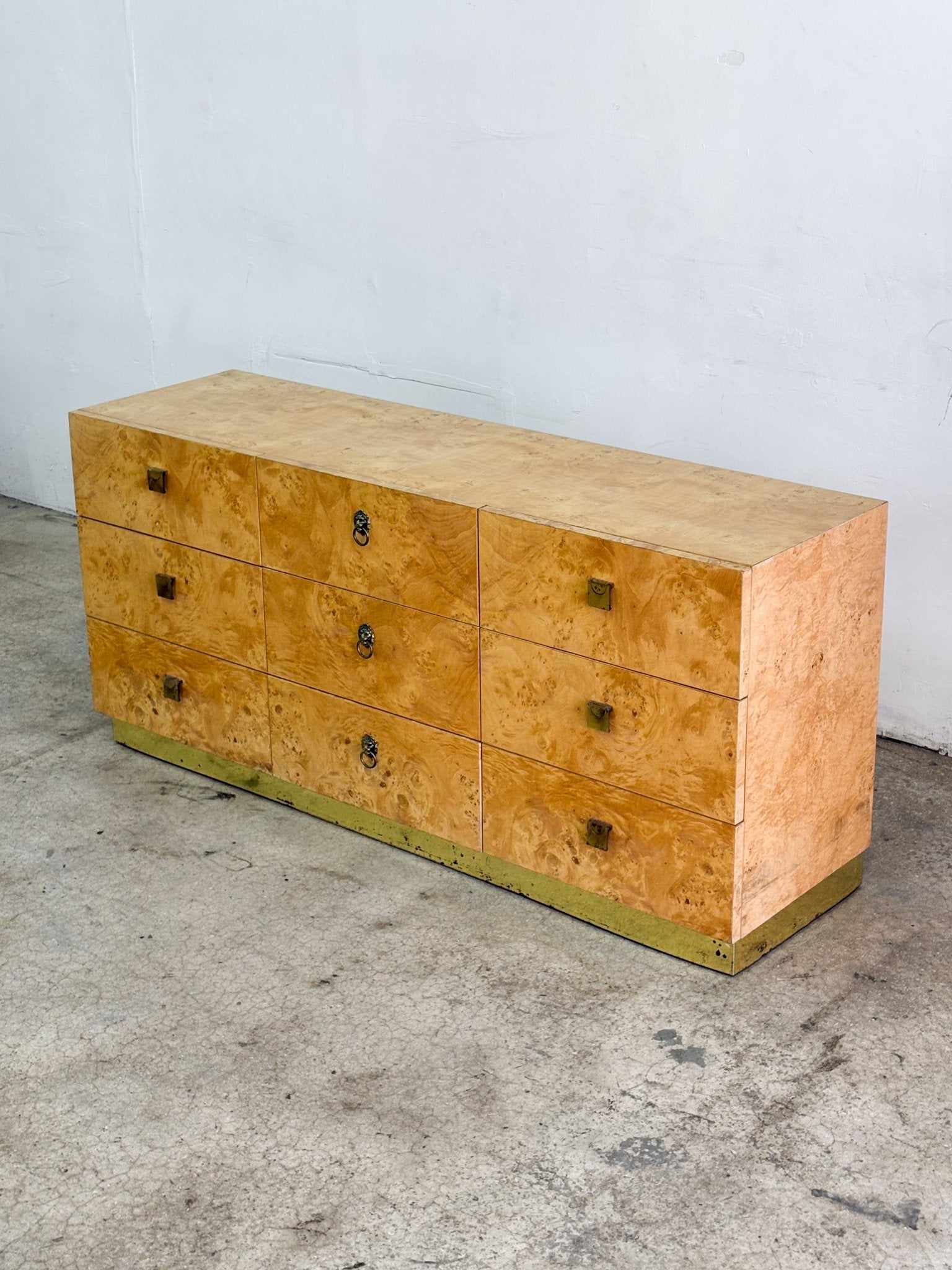 Stunning burl dresser with brass pulls and base. Brass and wood show some wear, see photos for condition notes.