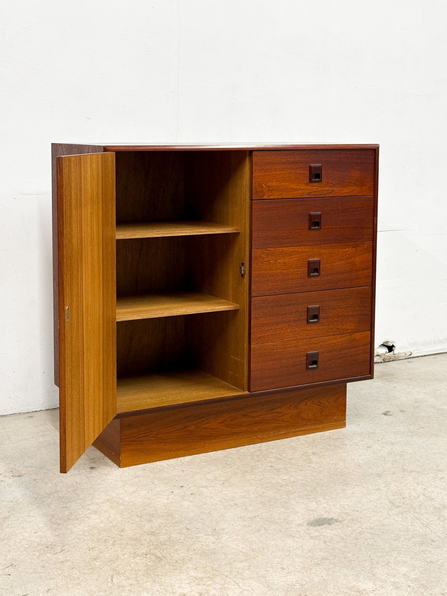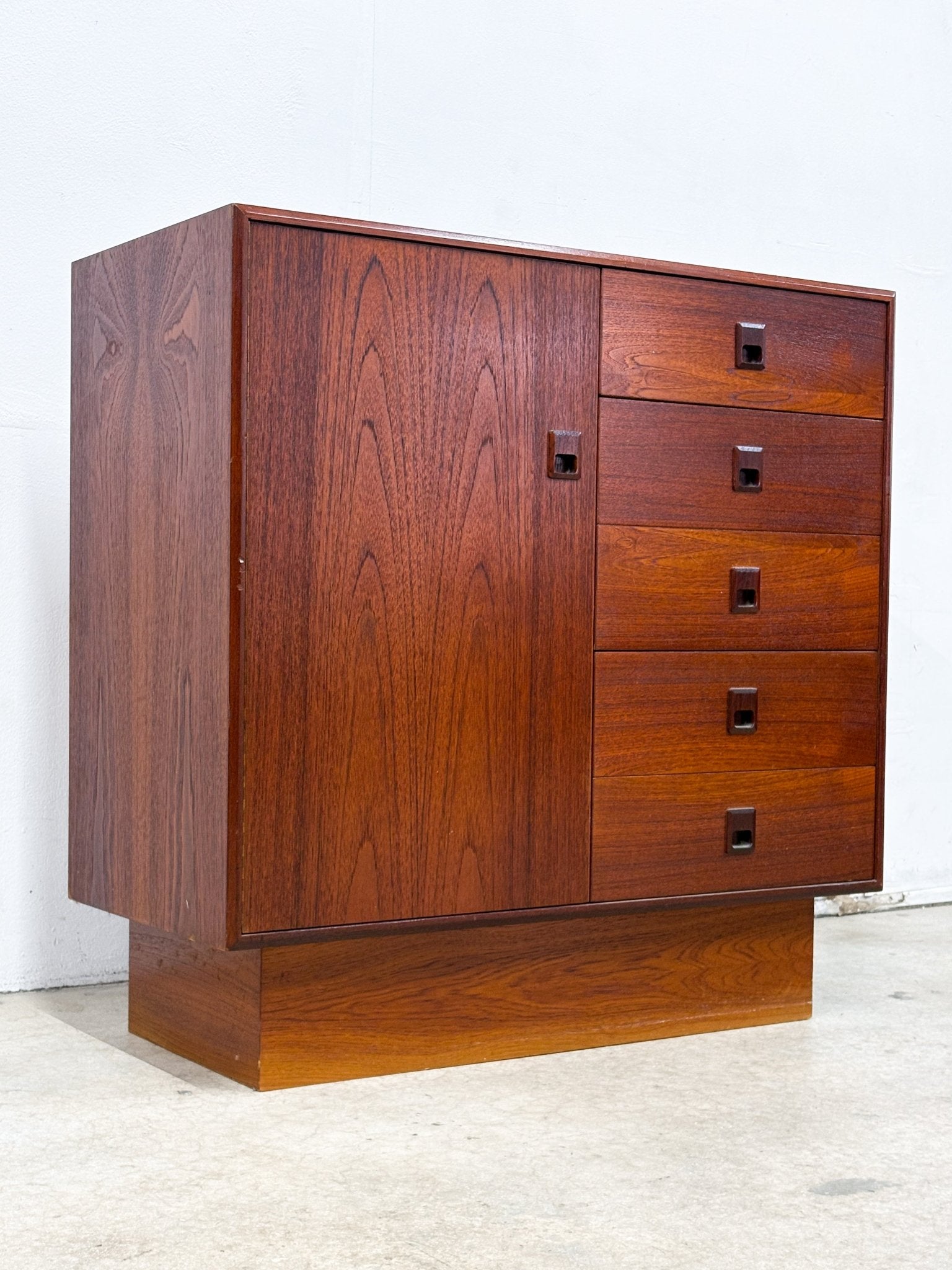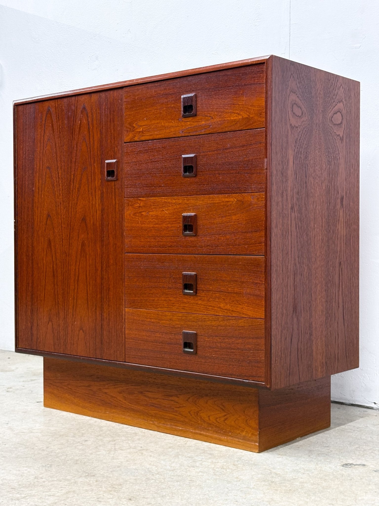Dark redish teak gentlemen's chest / armoire / tallboy dresser with five drawers, and shelfs behind door. In good condition with some wear on the top. Danish design and style, made in Canada.
