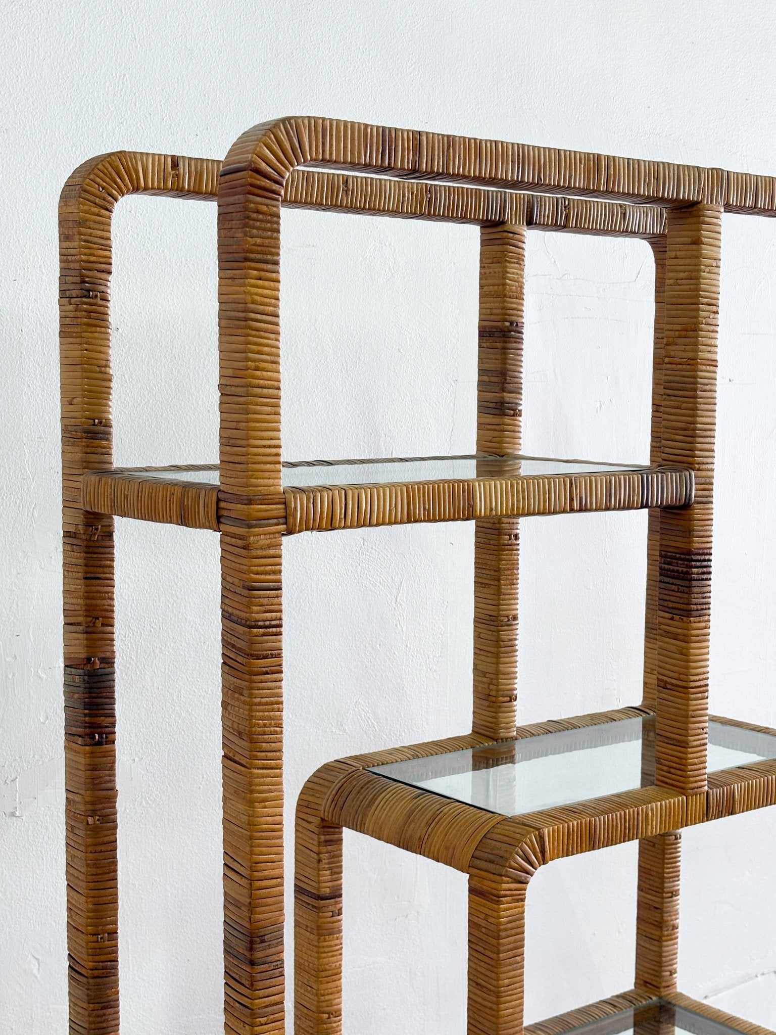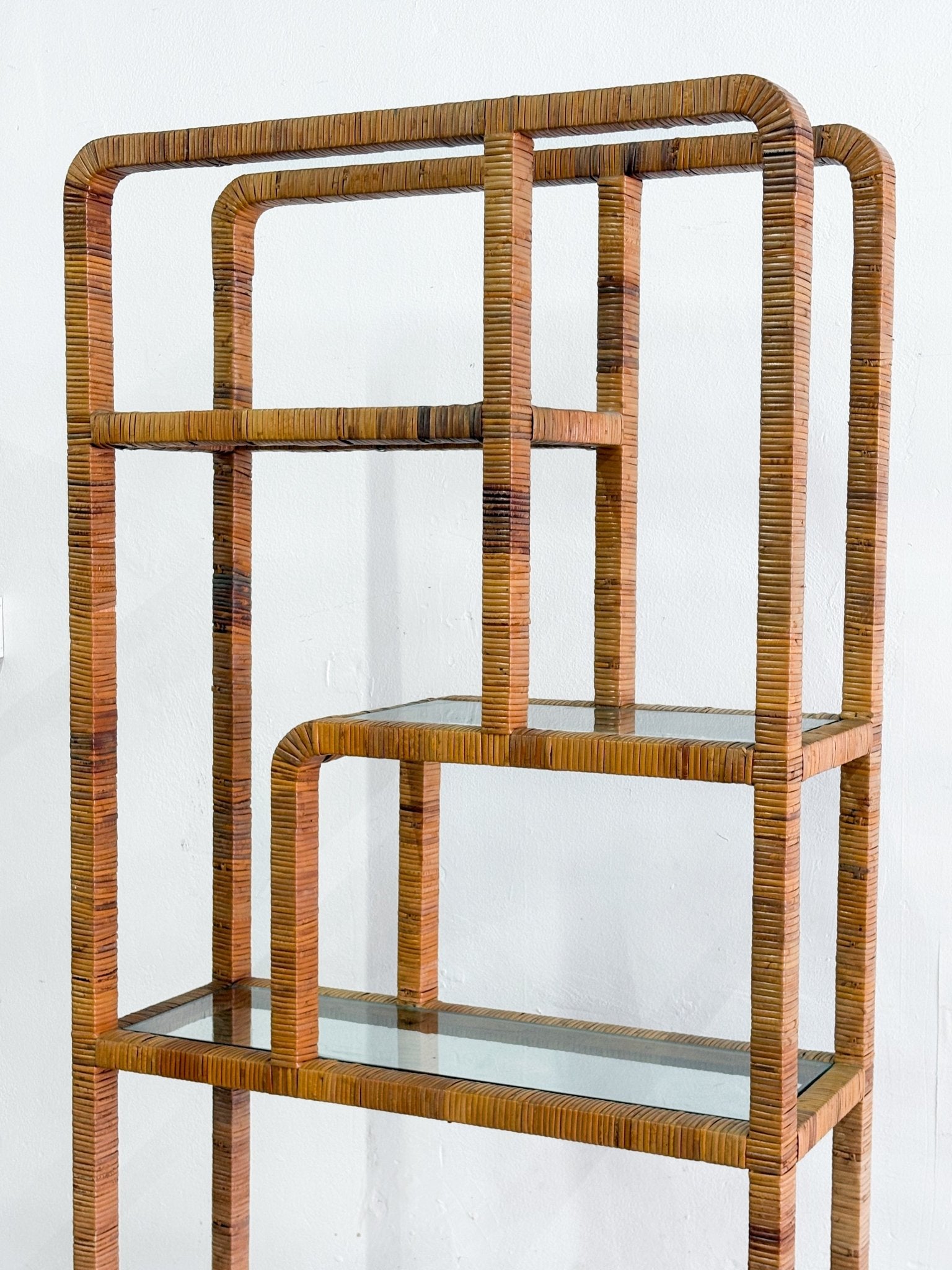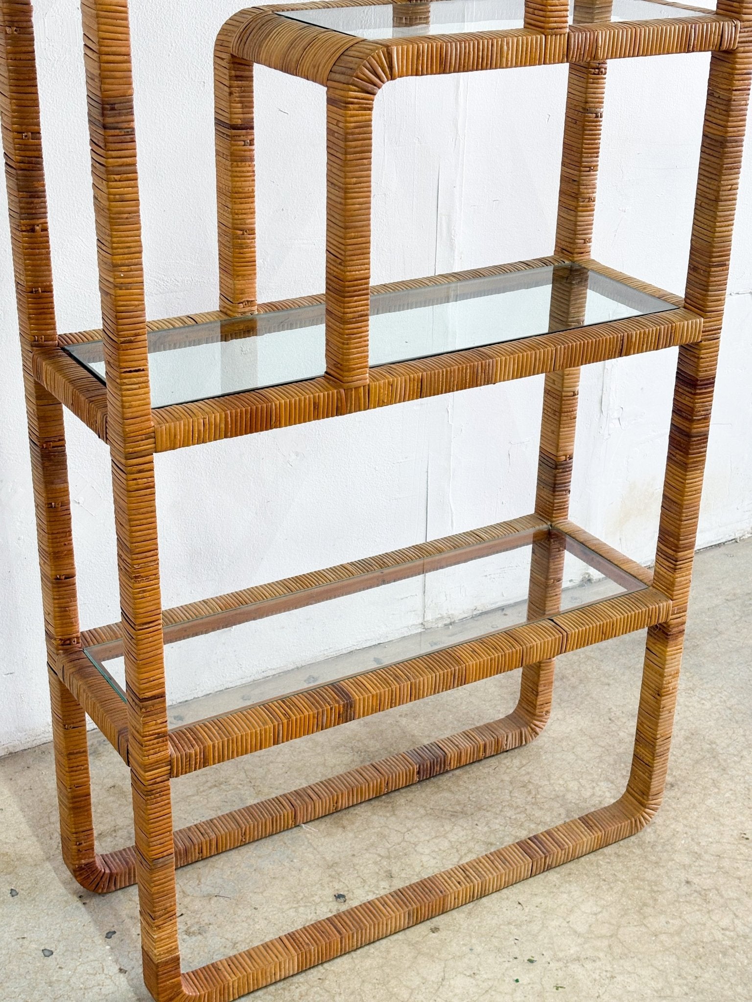Curved corners on this rattan-wrapped etagere. Wood and rattan are in great condition. Two glass shelves have a chip in the corner.