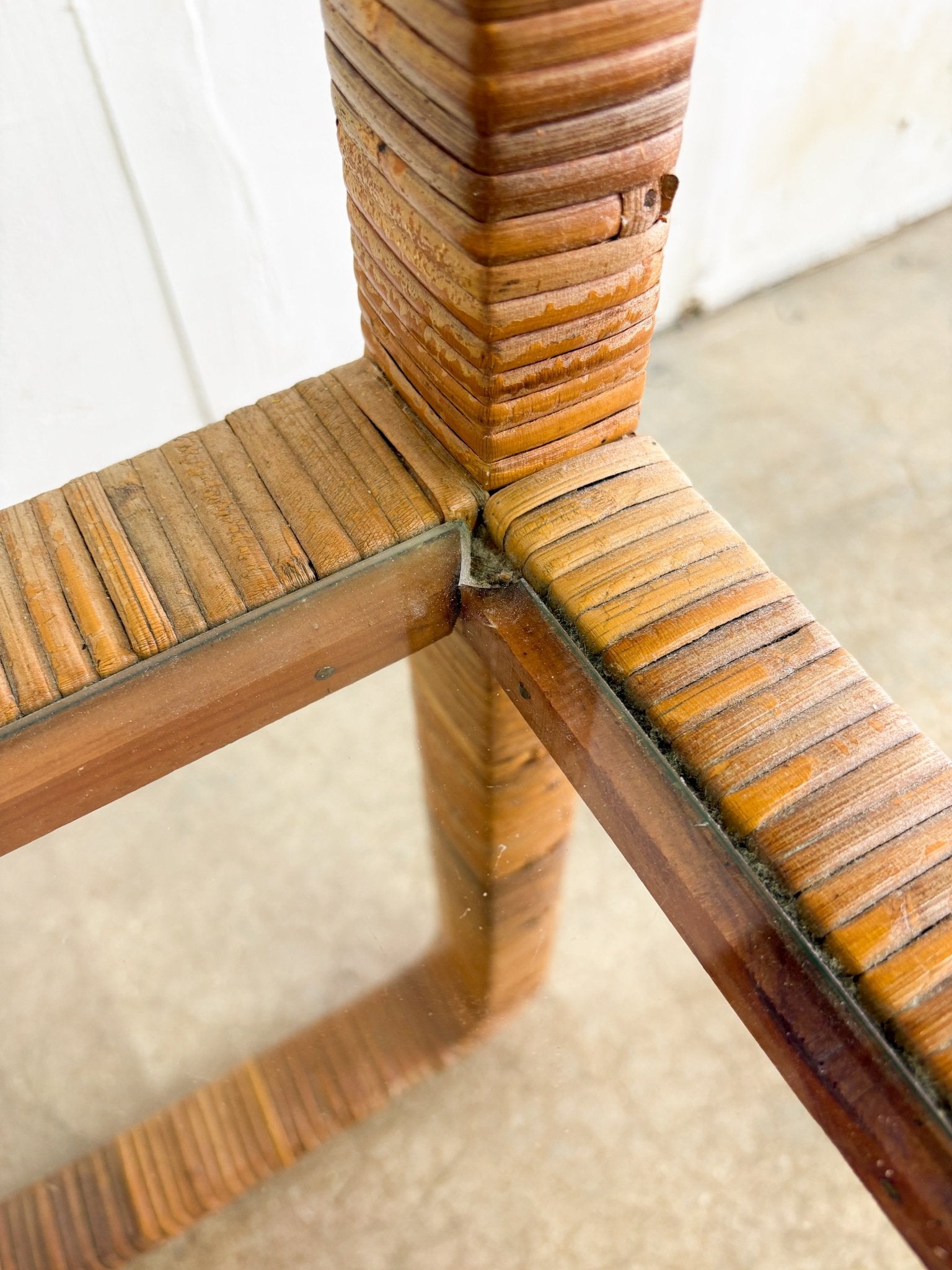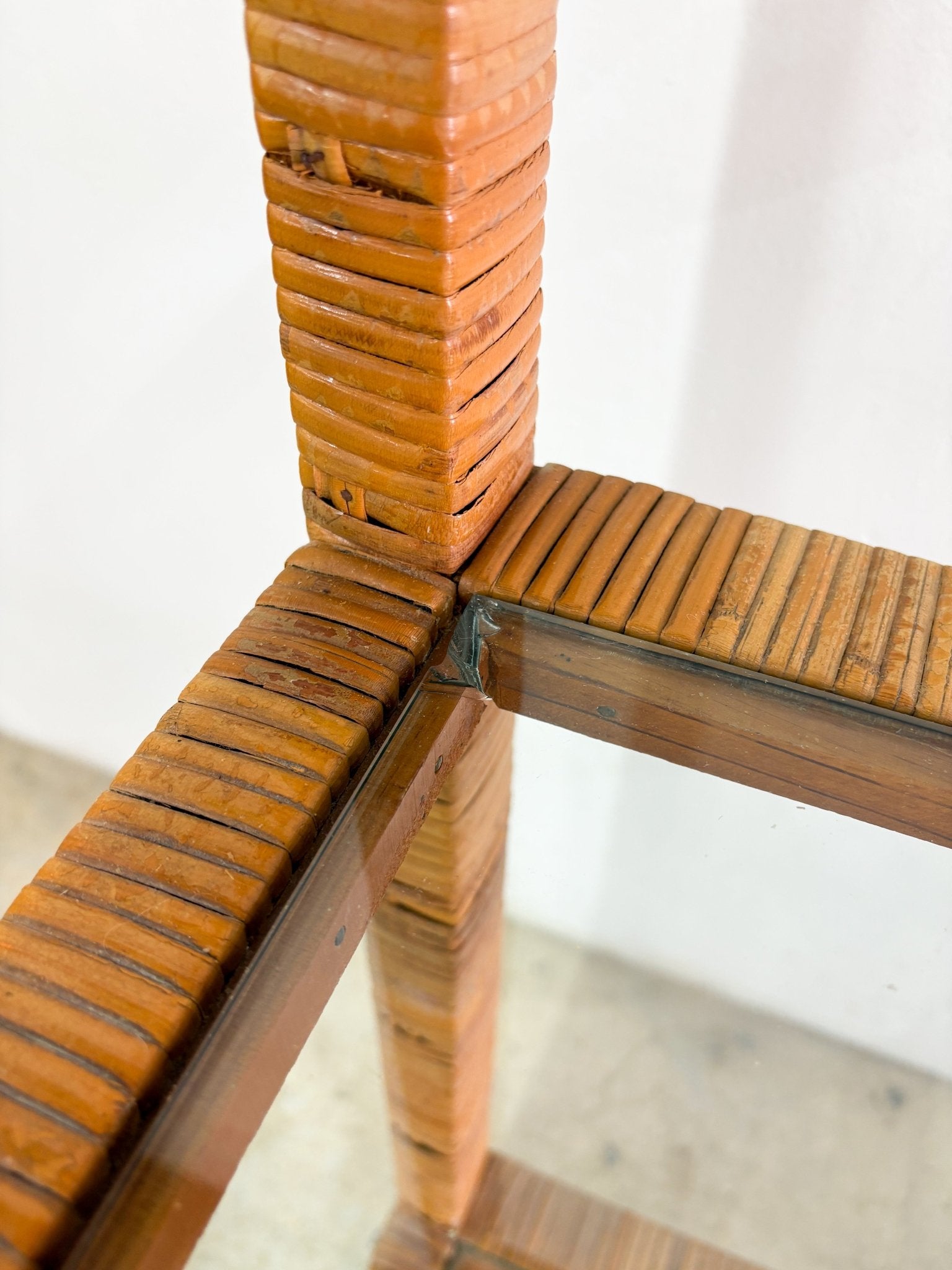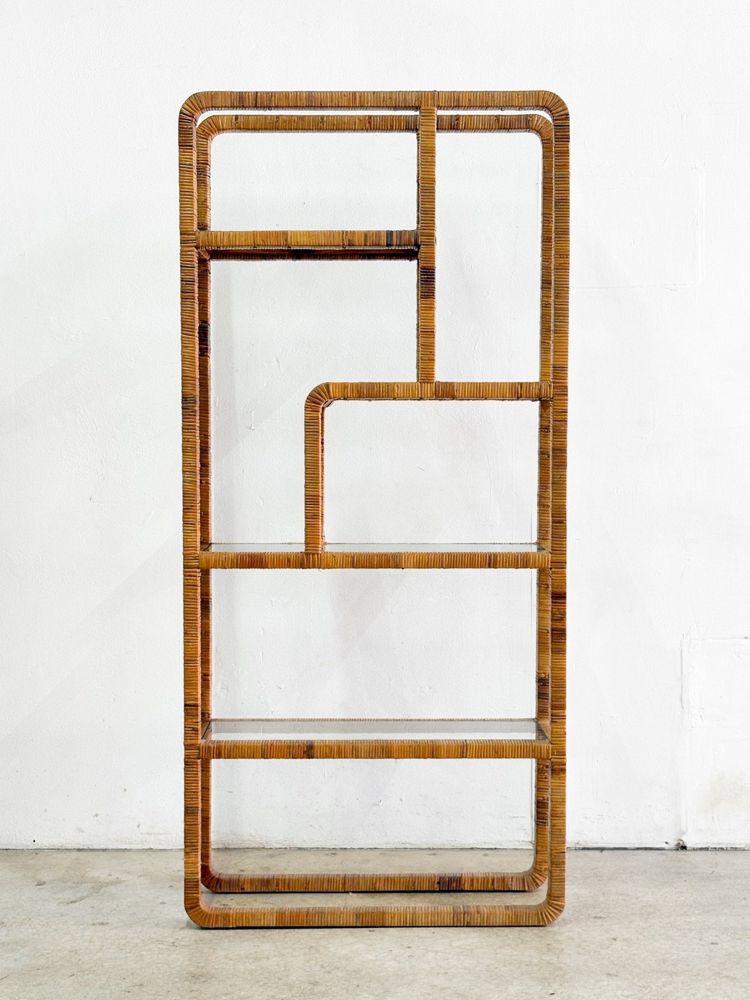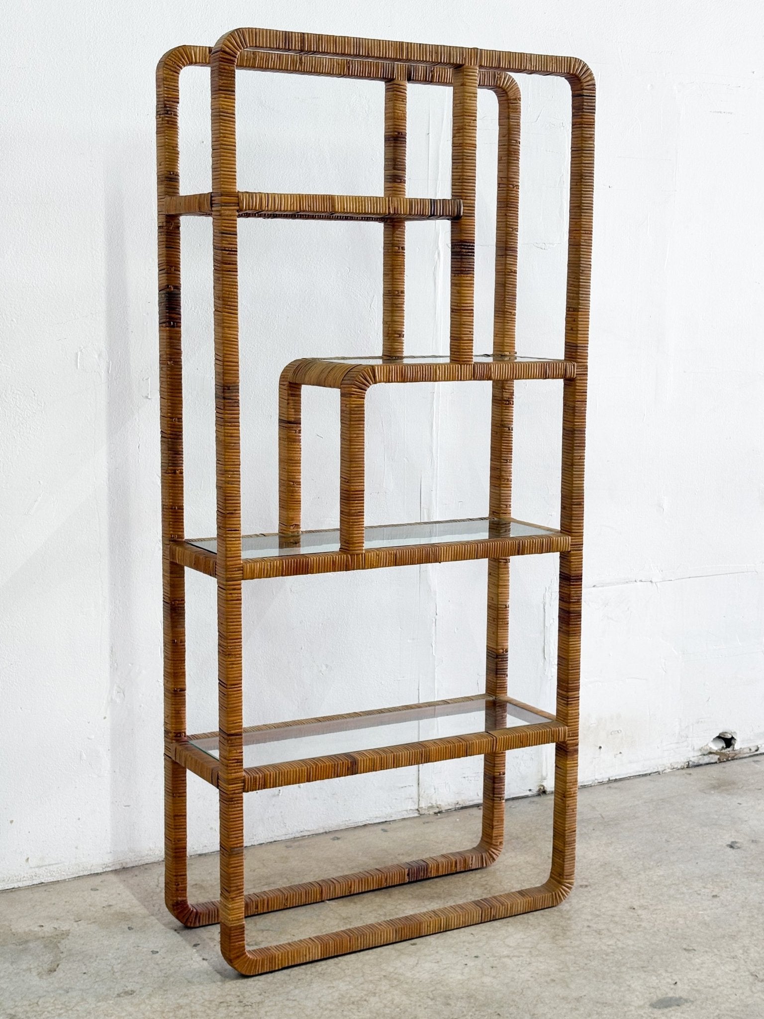 Curved corners on this rattan-wrapped etagere. Wood and rattan are in great condition. Two glass shelves have a chip in the corner.