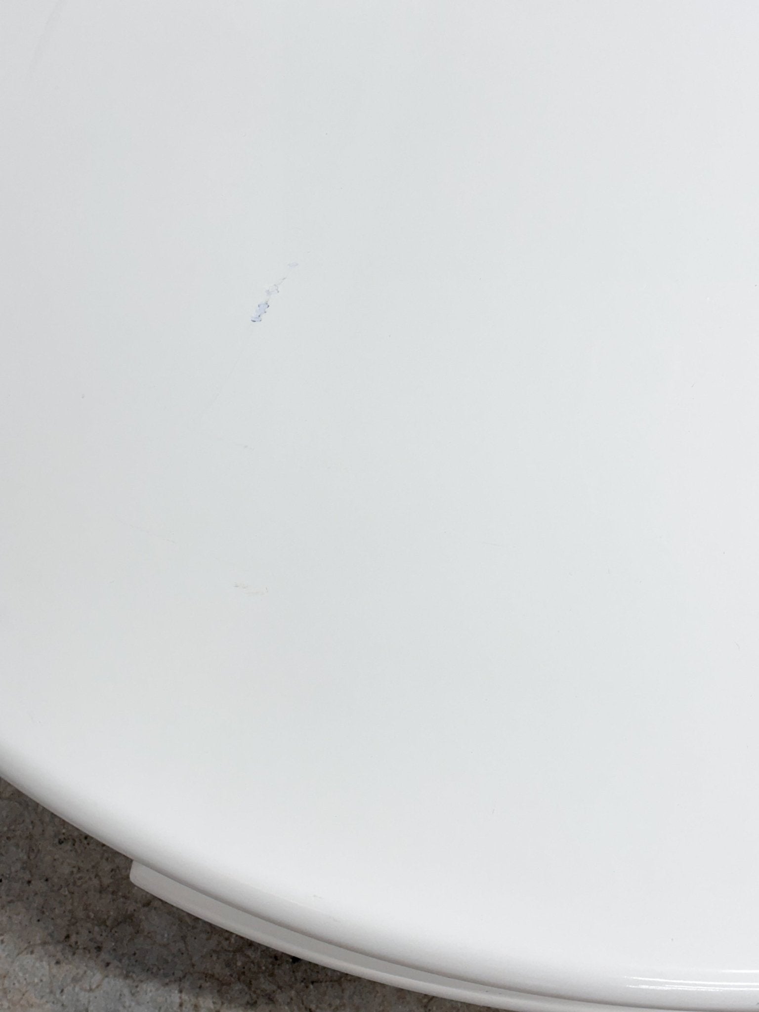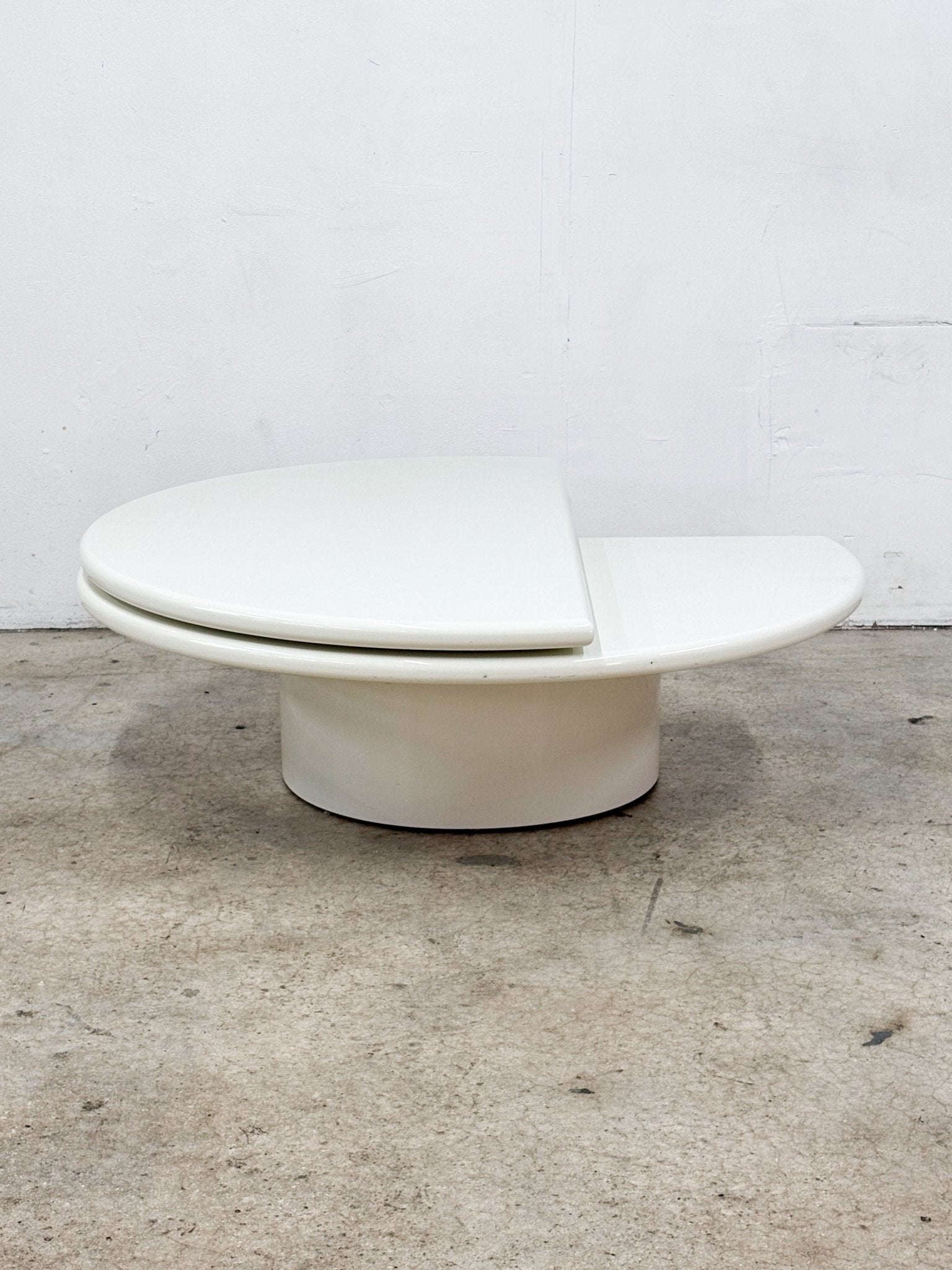 White half-circle to full swivel coffee table. Lower level in great condition, with large scratch (approx 3") on the top. Some scuffs and chips along the outside. See photos. Depth is 30" when closer, 48" when opened.